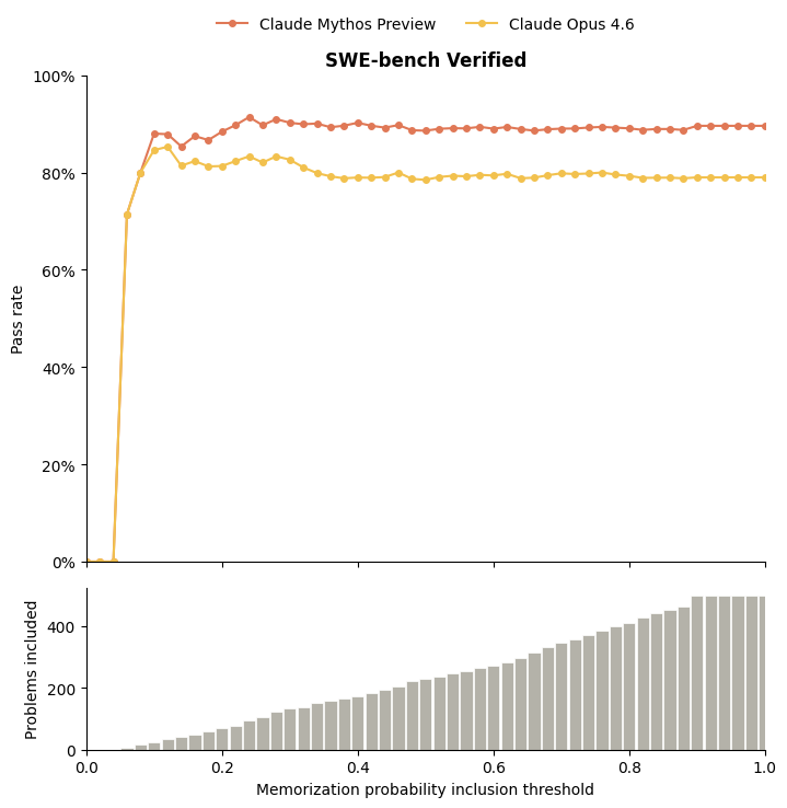 Mythos’ system card contains the following graph to support its argument that Mythos performs better on SWE-bench: