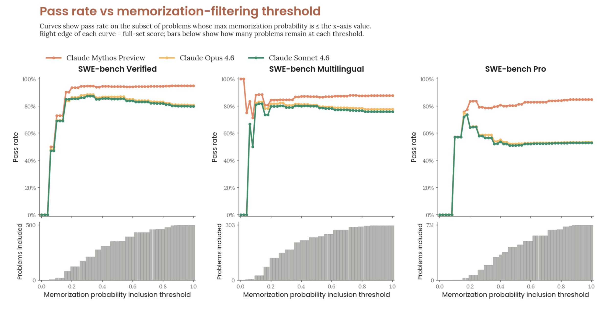 Anthropic and others are worried LLMs are memorizing SWE-bench, so they asked an LLM to estimate the probability that a solution is memorized. Next, they calculated the pass rate if they only included solutions an LLM judged to be memorized with less than 5% confidence, 10% confidence, and so on.