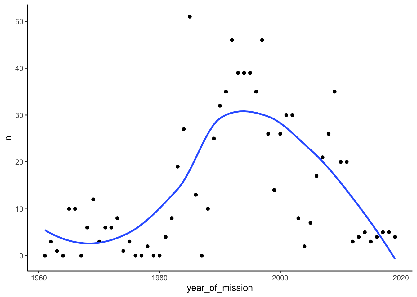count(year_of_mission, wt = sum(nationality == "U.S.")) %>%