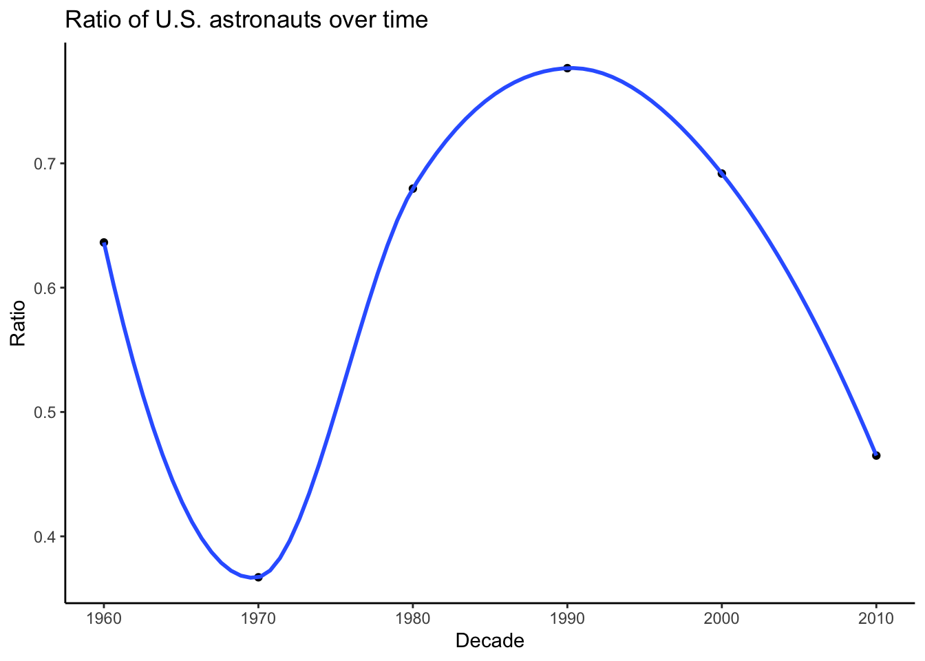 Unfortunately, this isn’t surprising. I wonder if the ratio of male to female astronauts has become more equal over time.1 Let’s see: